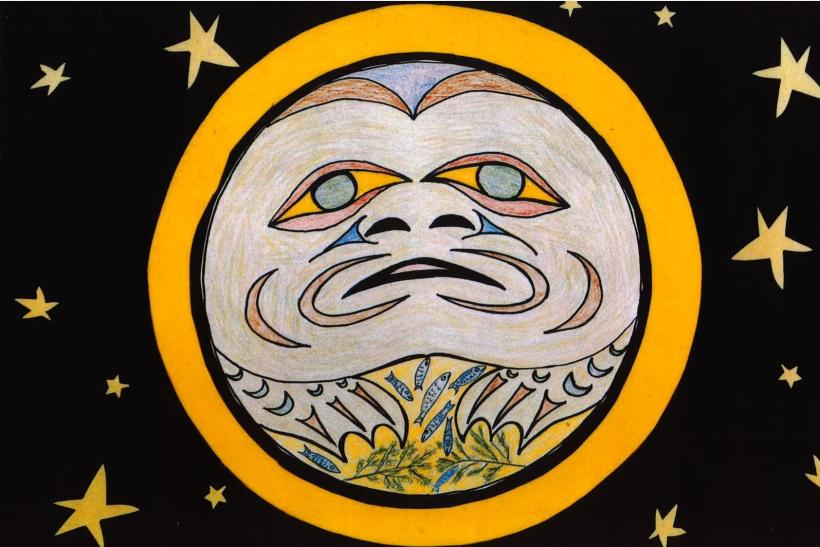 This moon in particular is significant because the frog acts as both a witness and a messenger to the Saanich people. He announces the Sacred Season of Plenty and SXE ANEW (frog) interprets “Sacred Season.” Because the frog is honoured as the keeper of the sacred seasons, it is often present on totem poles and in artwork to show that an important event has occurred.